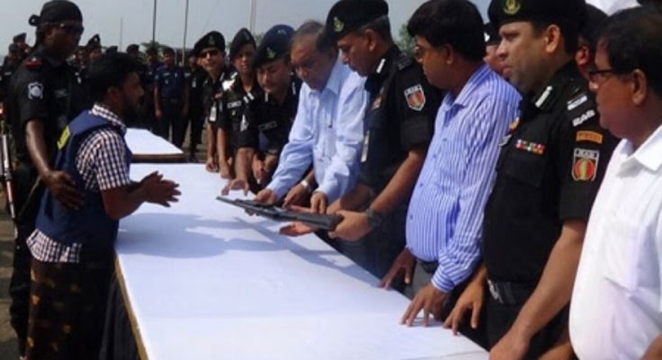 শুক্রবার দুপুরে বাগেরহাটের মংলা বন্দরের বিএফডিসি (ফুয়েল) জেটিতে স্বরাষ্ট্রমন্ত্রীর হাতে অস্ত্র ও গুলি তুলে দিয়ে আত্মসমর্পণ করেন ওই ১১ দস্যু।