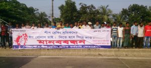 সংগঠনের কার্যকরী সভাপতি আবদুর রহিম মাস্টারের সভাপতিত্বে আয়োজিত মানববন্ধনে বক্তব্য রাখেন সংগঠনের যুগ্ম সম্পাদক আবুল কালাম, সাংগঠনিক সম্পাদক রাজিবুল ইসলাম, অর্থ সম্পাদক রবিউল ইসলাম, প্রচার সম্পাদক আবু নূর মিয়াসহ প্রমুখ। আরও উপস্থিত ছিলেন সংগঠনের কার্যকরী পরিষদের সদস্য সওয়ার হোসেন, মো. শাহীন, মো. শহিদ, মতিউর রহমান, বিপ্লব।