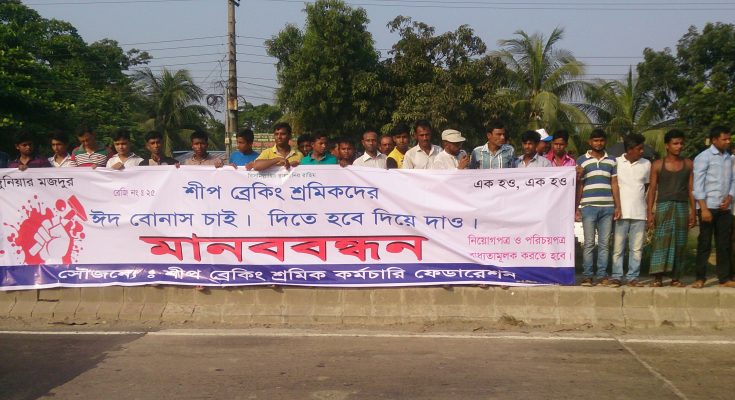 চট্টগ্রামের সীতাকুন্ডের মাদামবিবিরহাট বাজারে ঈদের বোনাসের দাবিতে মানববন্ধন করেছে জাহাজভাঙা কারখানা শ্রমিকেরা। আজ শুক্রবার বিকেল চারটার দিকে শিপব্রেকিং শ্রমিক কর্মচারী ফেডারেশনের উদ্যেগে আয়োজিত মানববন্ধনে অংশ নেন সীতাকুণ্ডের সবগুলো জাহাজ ভাঙ্গার কারখানার শ্রমিকেরা।