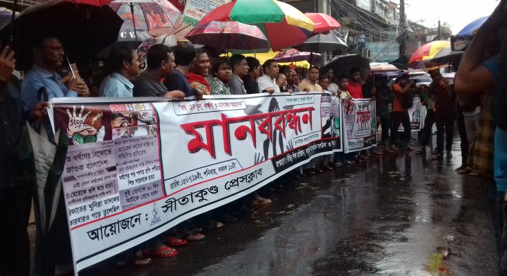 ‘বন্ধ হোক খুন, ধর্ষণ ও মাদকের আগ্রাসন, অপরাধ করব না, অপরাধ সইব না’ এ স্লোগানে সীতাকুণ্ড প্রেস ক্লাবের আয়োজনে এক মানববন্ধন অনুষ্ঠিত হয়েছে। শনিবার (১৩ জুলাই) ঢাকা-চট্টগ্রাম মহাসড়কে উক্ত মানববন্ধনে অংশ নেয় জনপ্রতিনিধি, অর্ধ শতাধিক সংগঠনসহ সাধারণ মানুষ। বৃষ্টি উপেক্ষা করেও খুন, ধর্ষণ, মাদকের বিরুদ্ধে প্রতিবাদ জানাতে রাস্তায় নেমে আসে সীতাকুণ্ডের হাজারো মানুষ।